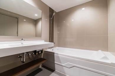 Spacious 60 sqm layout with a wide balcony and a bathtub.