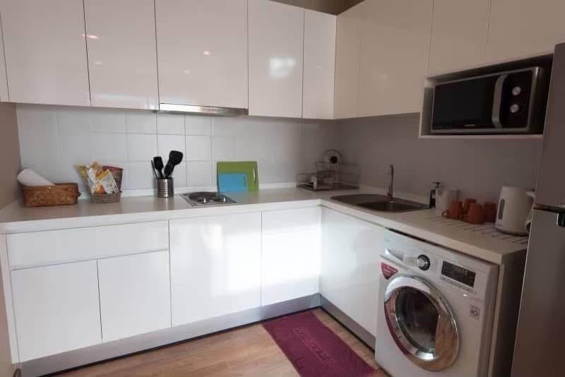 Fully equipped kitchen with appliances including refrigerator, microwave and washing machine.