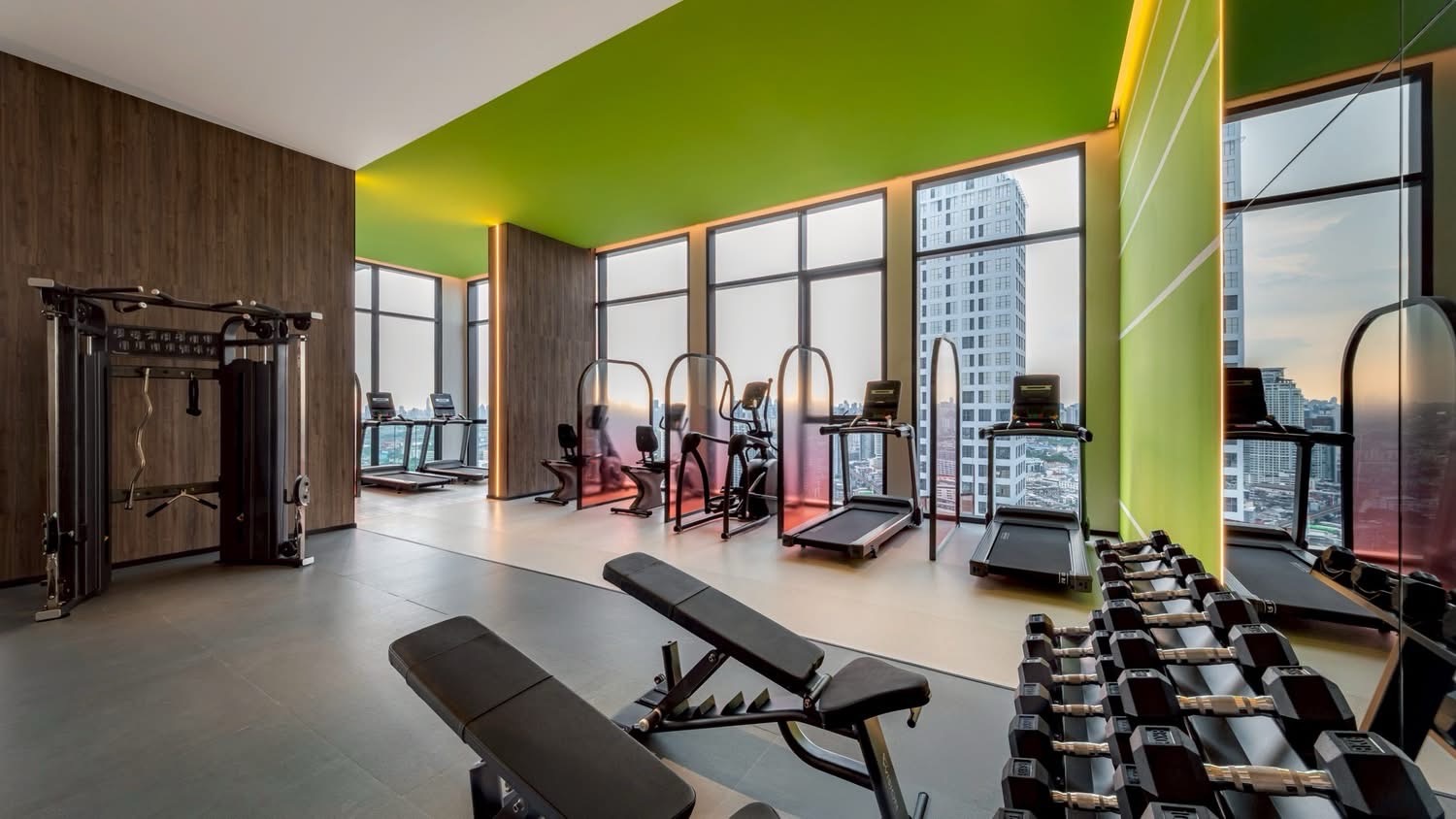 Resort-style facilities include a swimming pool with jacuzzi, fitness center with sauna, and rooftop green space.