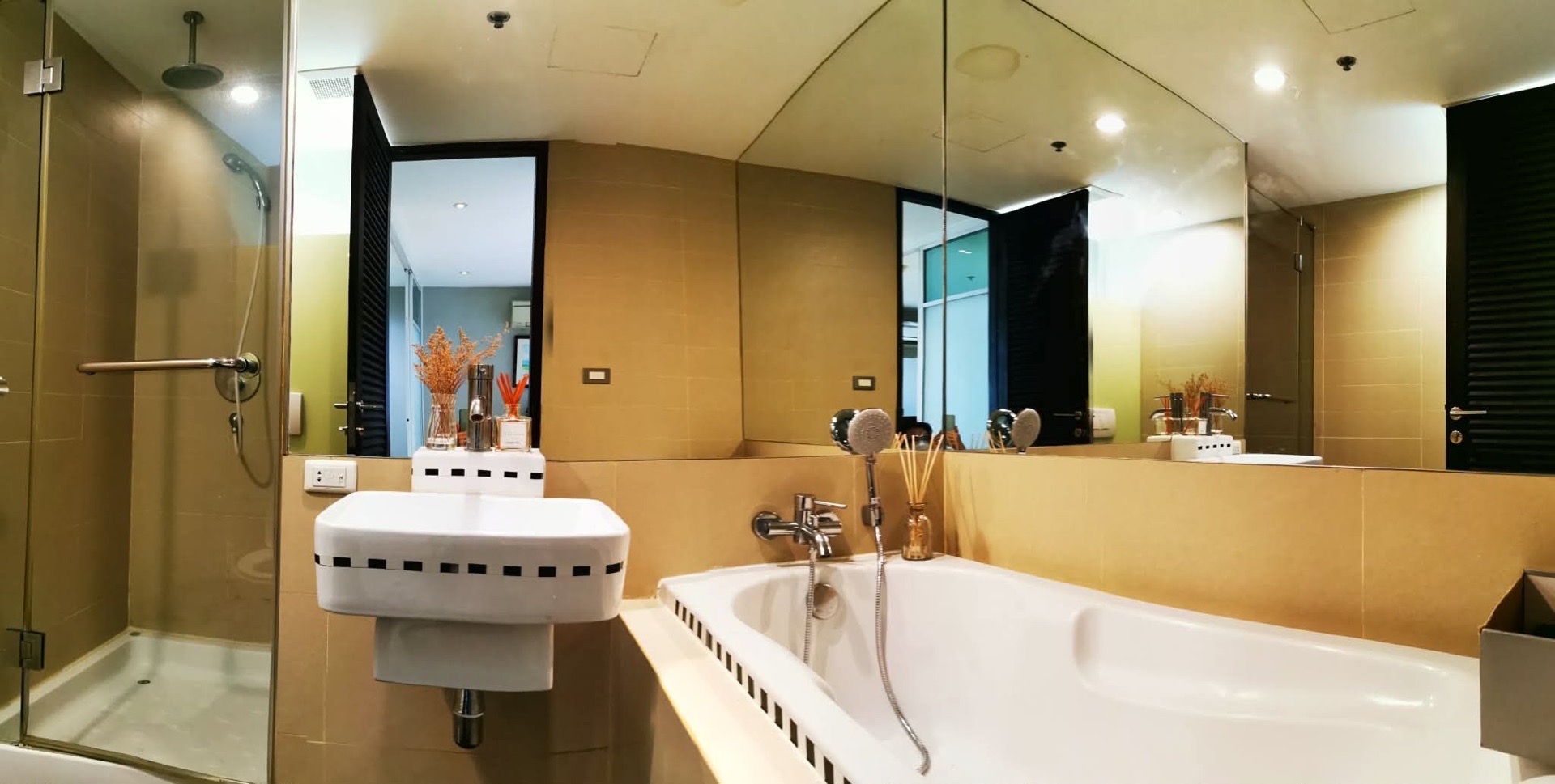 The bathroom includes both a bathtub and a separate shower box for convenience.